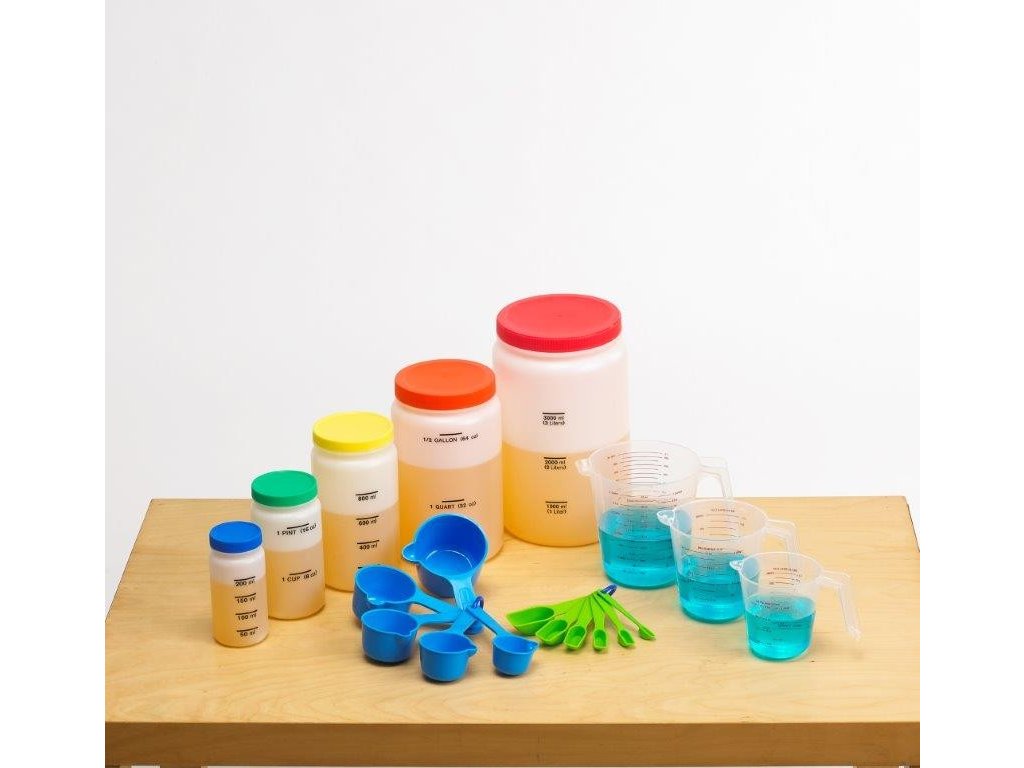 Sada pro měření objemu kapaliny, včetně 5 nádob pro měření objemu, 3 měřicí džbány, 5 měřicích šálků a 6 měřicích lžic.