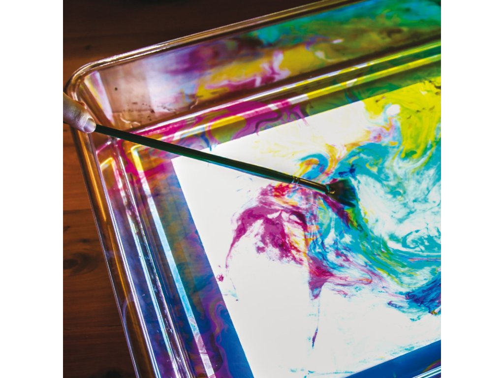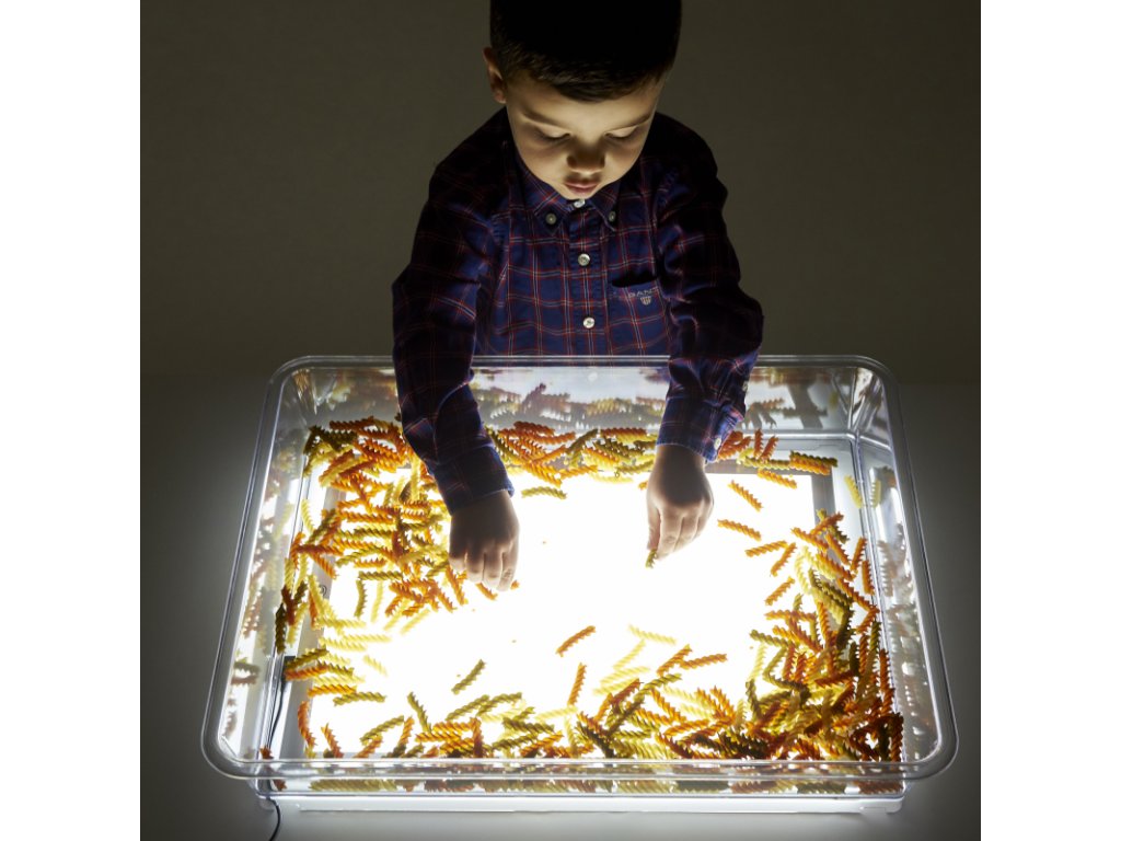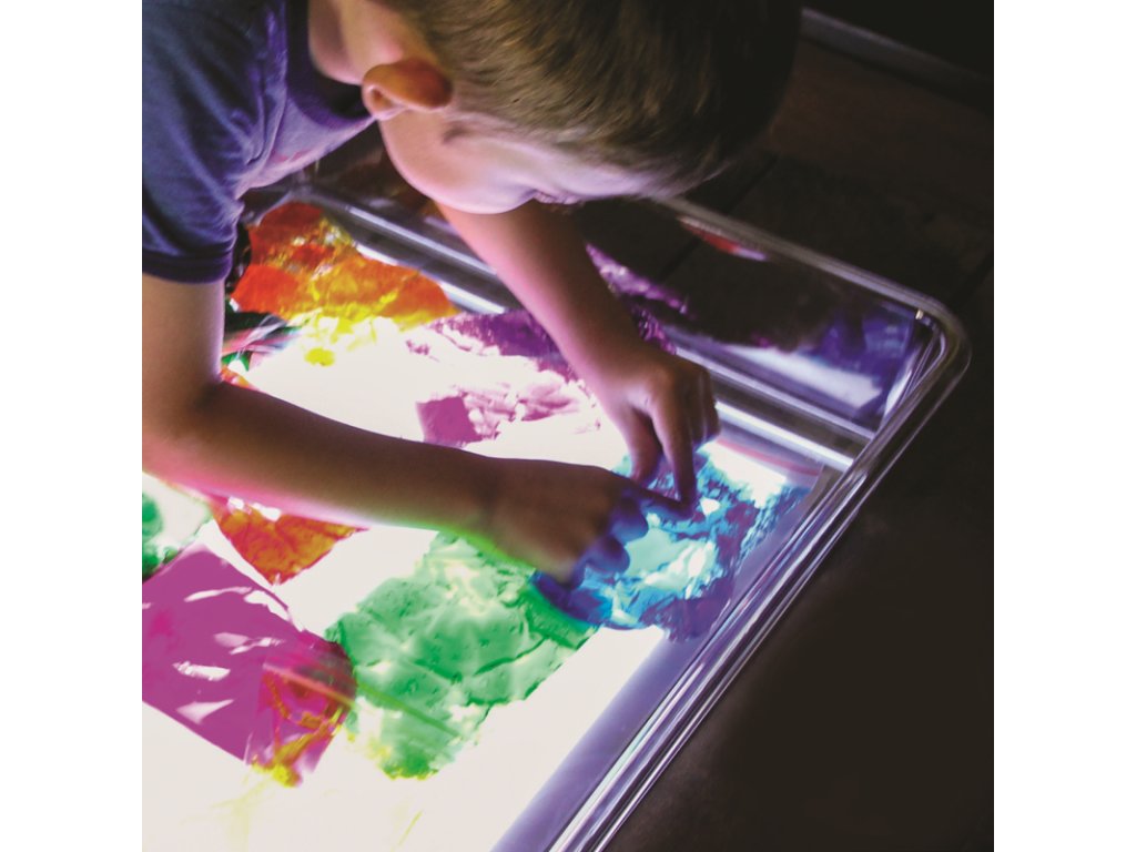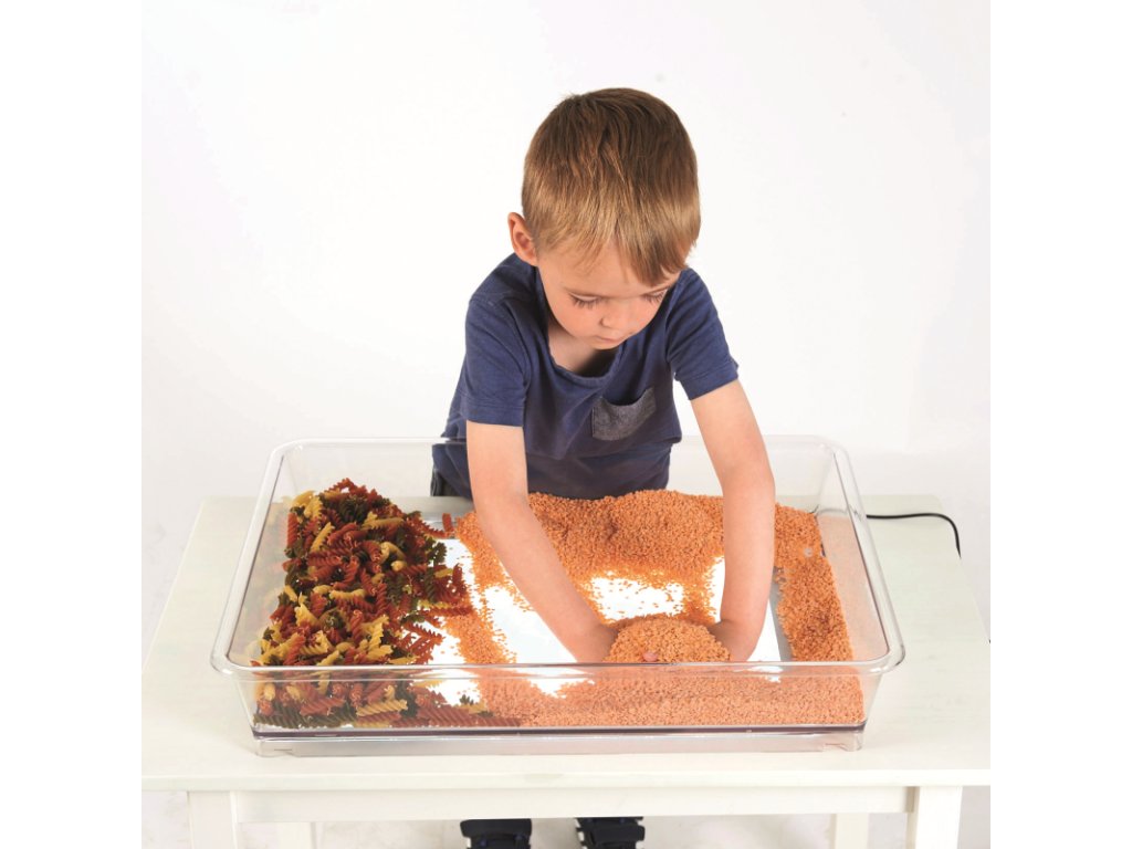 Součástí sady je průzkumný tác z čirého, mimořádně odolného polykarbonátu. Ten bezpečně přiléhá ke světelnému panelu a vytváří uzavřený prostor pro kreativní a smyslové aktivity.