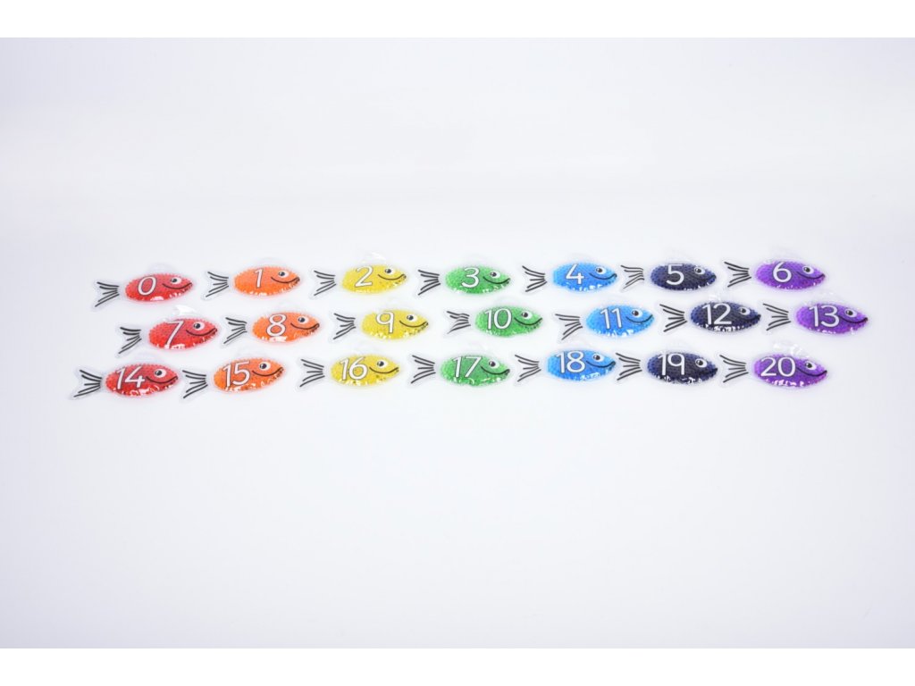 Na jedné straně rybek najdete puntíky odpovídající danému číslu, na druhé straně číslo od 0 do 20. Děti se mohou naučit počítat a propojovat čísla s odpovídajícími znaky Tímto způsobem se zábavně seznámí s číselnou řadou a rozvíjí své matematické schopnosti. Děti se také mohou učit rozpoznávat a spojovat barvy s odpovídajícími čísly. Tímto způsobem rozvíjejí své barevné vnímání a schopnost spojovat vizuální informace.