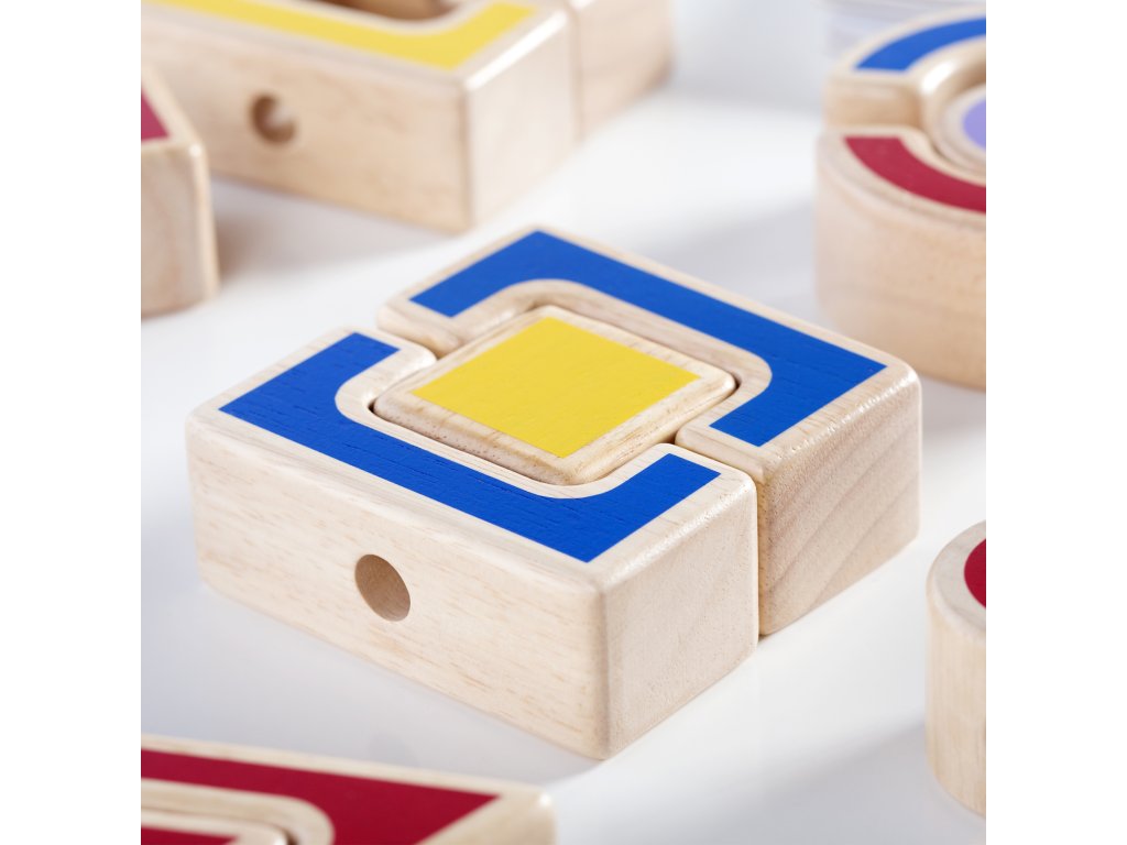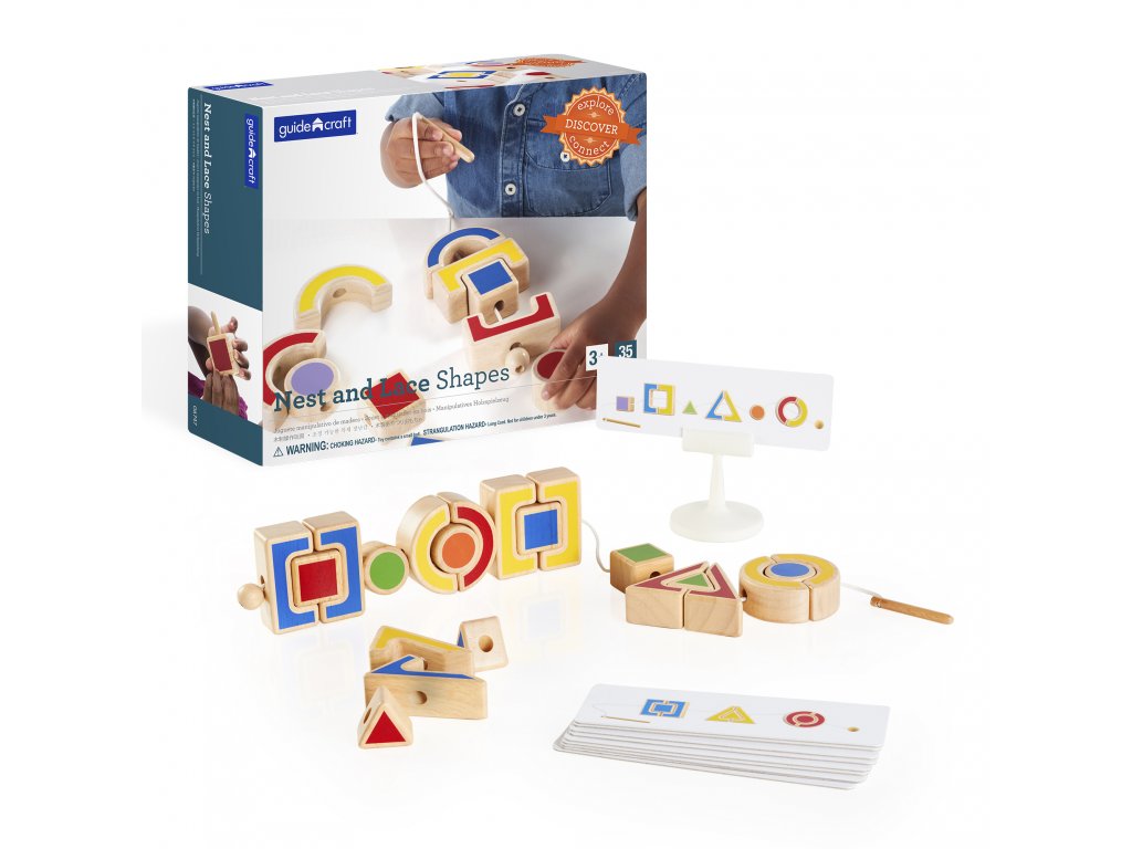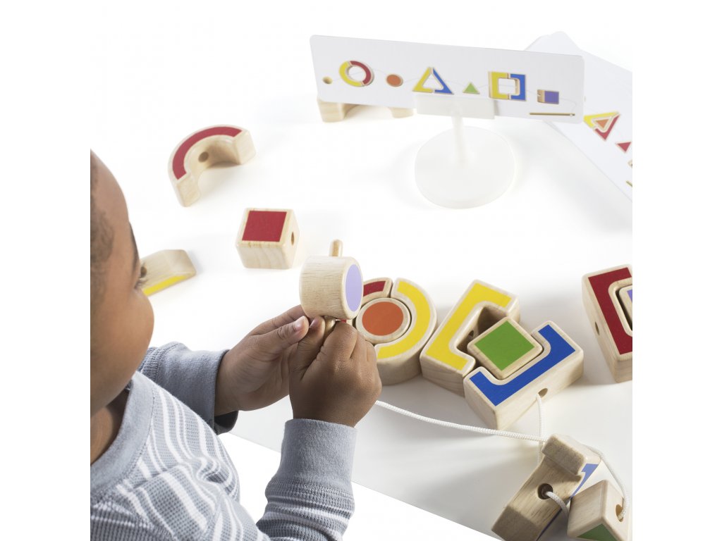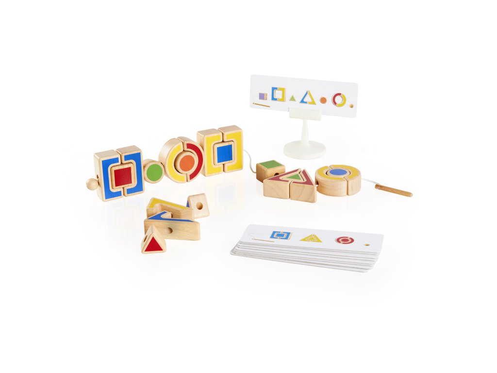 Hračka obsahuje sadu šablon, které slouží jako vzory pro navlékání geometrických tvarů. Děti se tak učí vzorovat a identifikovat různé tvary, což je důležitý krok před zvládnutím matematiky. Každý tvar je speciálně navržen tak, aby byl snadno uchopitelný dětskýma rukama, což pomáhá rozvíjet jejich jemnou motoriku. Prostřednictvím této hry se seznámí s různými geometrickými tvary a naučí se je identifikovat a vzorovat dle šablon.