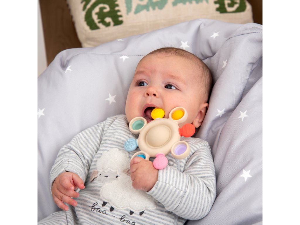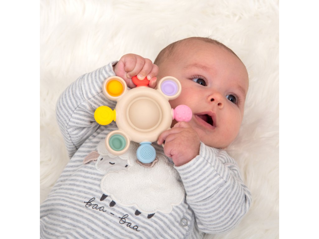 Vnější okraj hračky je osazen měkkými senzorickými kousátky, která dětem pomáhají ulevit od bolesti při prořezávání zoubků. Díky použití potravinářského silikonu je kousátko zcela bezpečné i pro nejmenší miminka. V centrální části se navíc ukrývá jemné chrastítko, které vydává uklidňující zvuky při každém zatřesení.